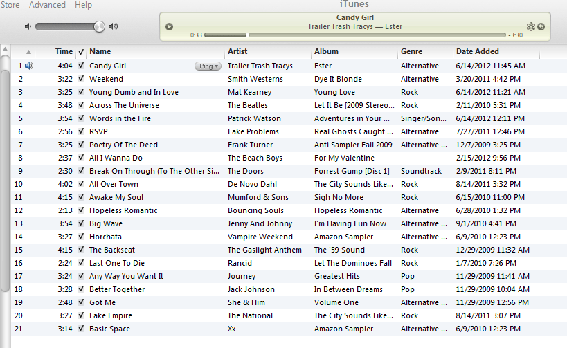 I made this playlist yesterday and added some new music to my iTunes library in the process. I got lucky too! Looking for some new songs brought me to NPR Music’s site through a post with the Top 25 Favorite Album of 2012 (So Far) and the song of the day just so happened to be one described as a “shoegaze lover’s dream.” Paul is a shoegaze lover and musician, so I just had to get “Candy Girl” by Trailer Trash TracyNPR’s Top 25 list also got me to download “Words in the Fire” by Patrick Wilson. Both are pretty sweet airy tunes that are perfect for a relaxing summer day.