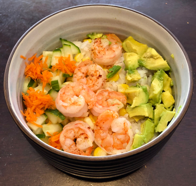 For each serving, do the following: Add cooked rice to the bottom bottom of a bowl. Add 1/4 cup of corn on top of the rice. Cut avocado into 1/2 inch slices and add about 1/4 of an avocado to the top of the rice. Cut the cucumber into thin slices, about 1/4 inch thick. From there, cut into quarts. Add about 3 or 4 slices worth to the bowl. Add about 6 to 8 small, cooked shrimp to each bowl, along with about 2 tablespoons of shredded carrot.